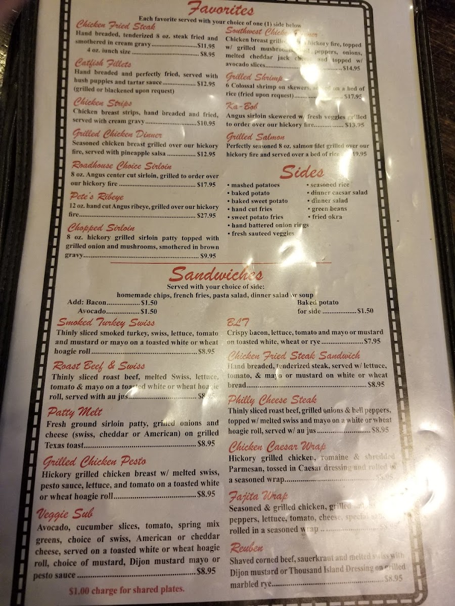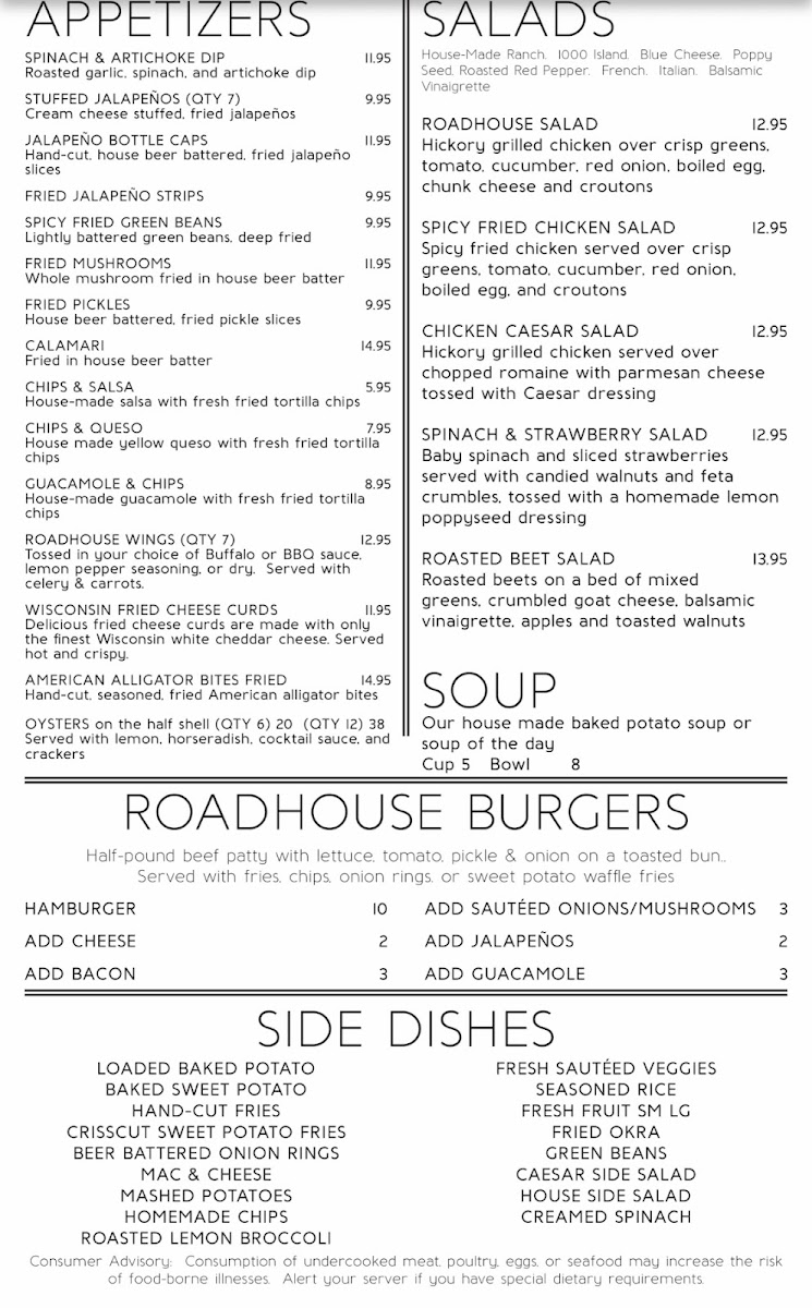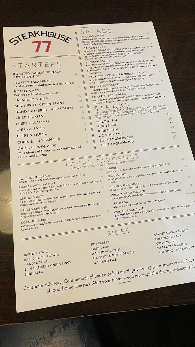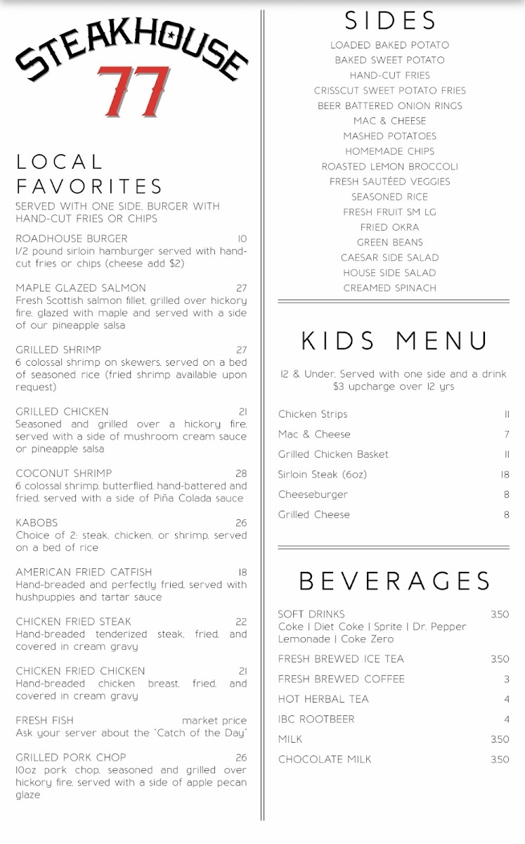 Welcome to Roadhouse 77, your go-to destination in Durant, OK, for mouthwatering comfort food and refreshing drinks! Our menu is a delightful fusion of classic and innovative dishes that cater to every palate. Whether you're craving our famous Chicken Fried Steak, the zesty Roadhouse Nachos, or the delectable Coconut Shrimp, there's something for everyone. Don’t miss out on our hearty Steak Sandwich or the fresh and vibrant KC Grilled Steak Salad, perfect for a satisfying lunch. Pair your meal with one of our signature cocktails, like a Frozen Margarita or Mojito, and finish off with a sweet treat, such as our indulgent Cheesecake or velvety Creme Brulee. Join us at 116 N 2nd Ave, and taste why Roadhouse 77 is where flavor meets fun!